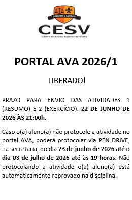 Fique por dentro dos eventos importantes, horários de atendimento, feriados, recessos, calendário de provas e atividades acadêmica do CESV, além do Guia do Aluno para aulas remotas o qual facilitará sua vida dentro da instituição.